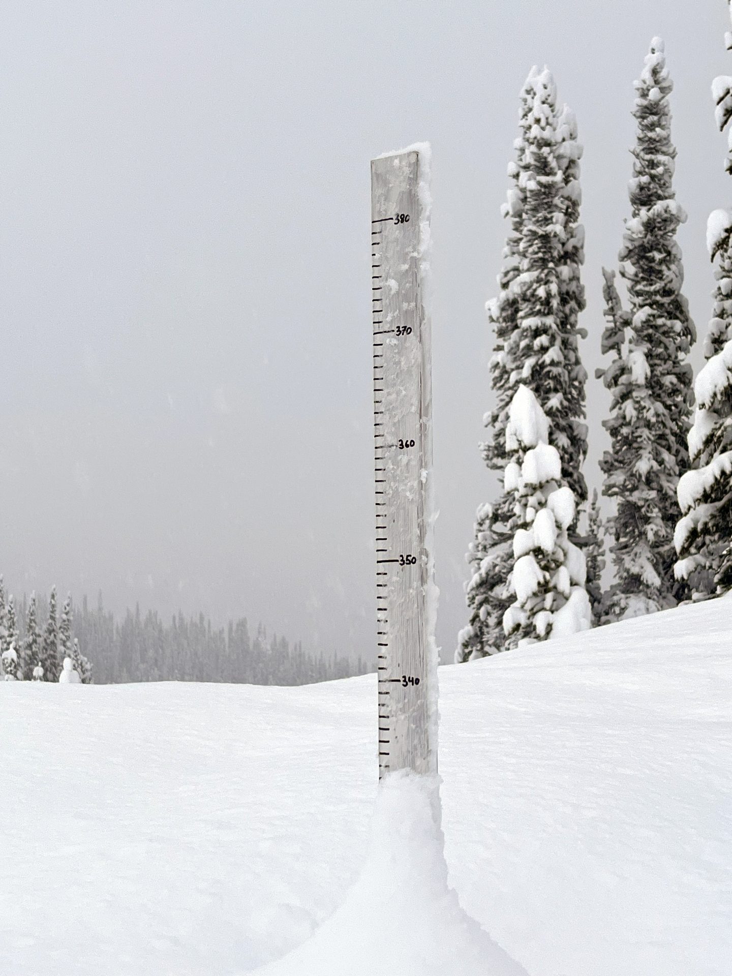 The atmospheric river this week has brought another 60 cm. Luckily temperatures have varied just above or below freezing. We had to put an extension on our 300 cm snow stake.